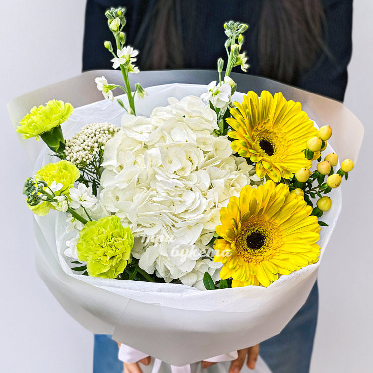Белый букет с гвоздиками и герберами