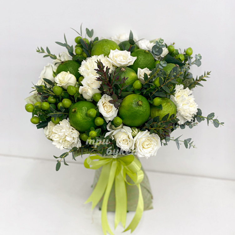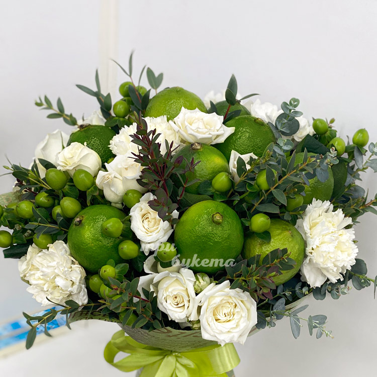 Букет белых гвоздик и роз с лаймами