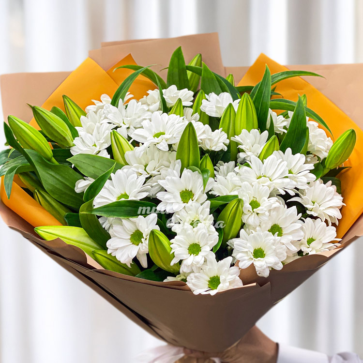 Букет белых хризантем и белых лилий