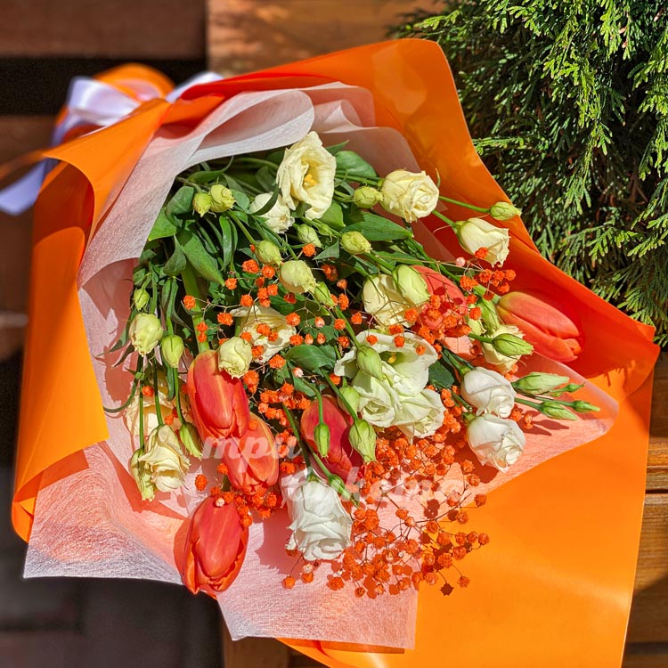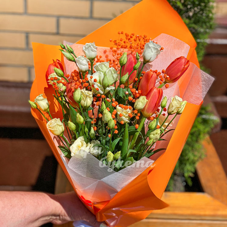 Букет эустом, тюльпанов и гипсофилы