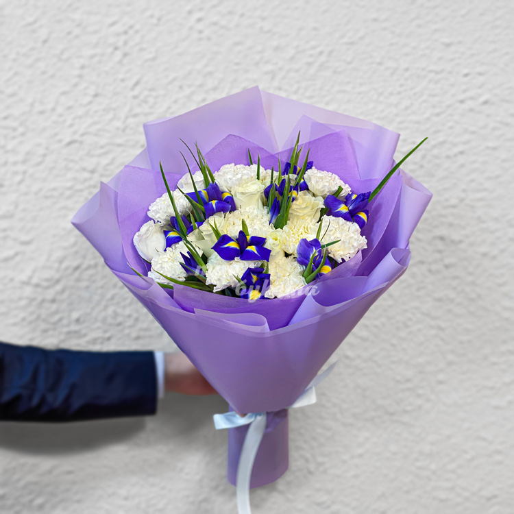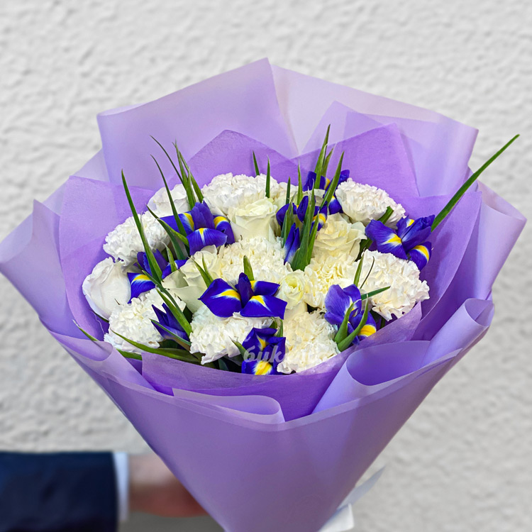 Букет ирисов, белых роз и гвоздик