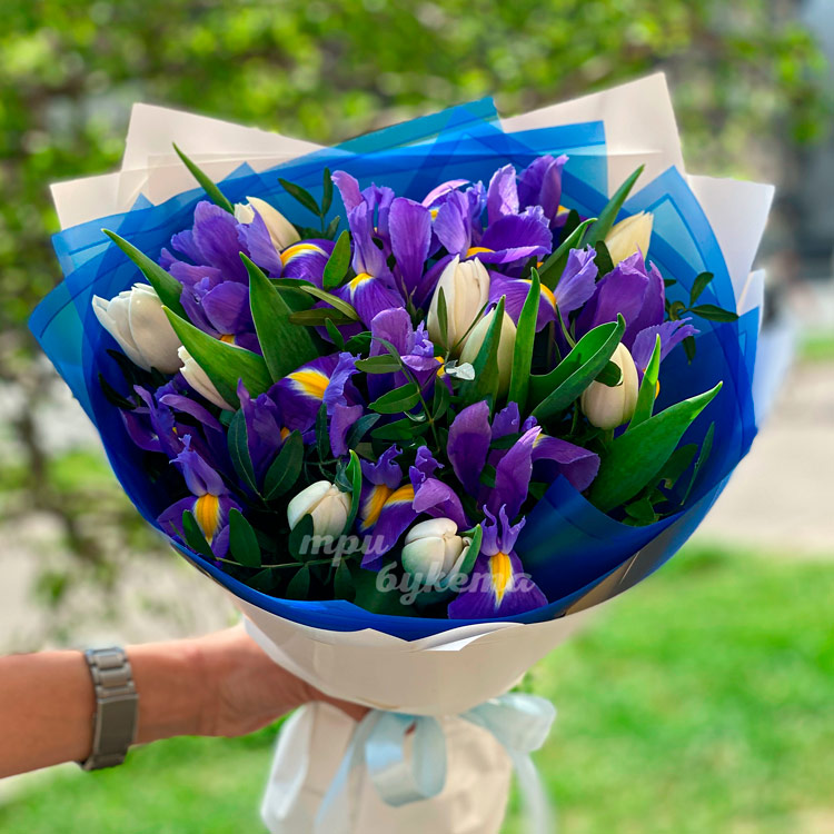 Букет из ирисов и белых тюльпанов