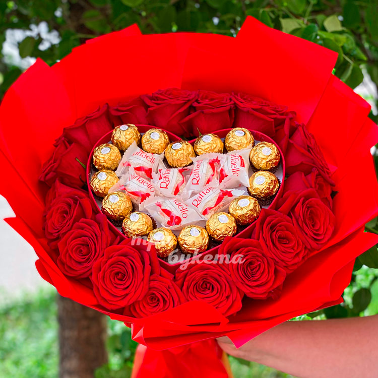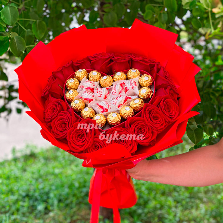 Букет красных роз с конфетами