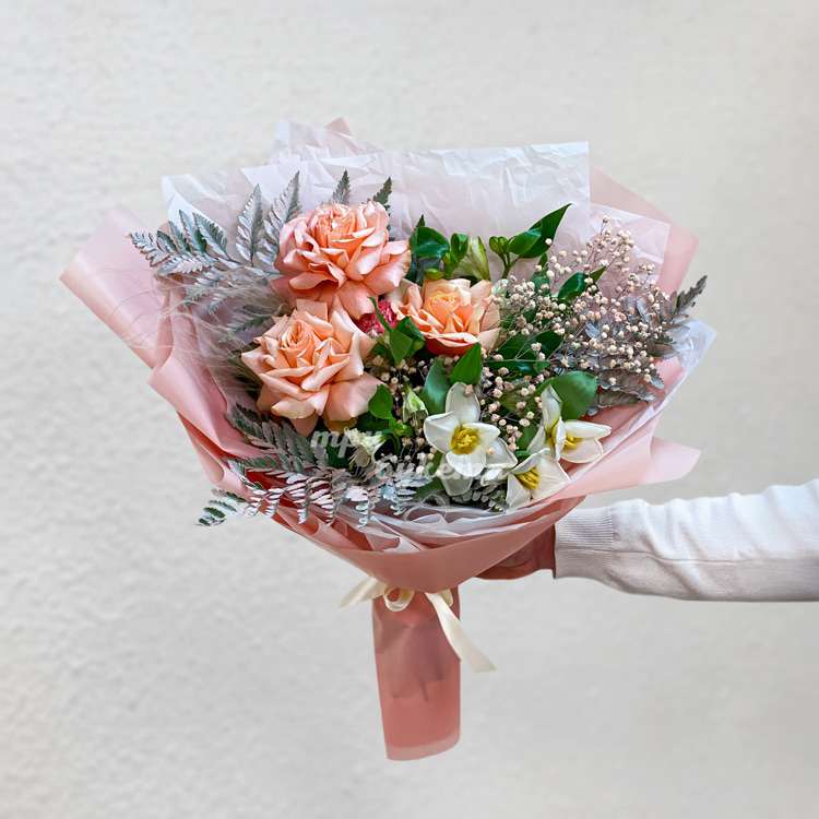 Букет персиковых роз с белыми нарциссами