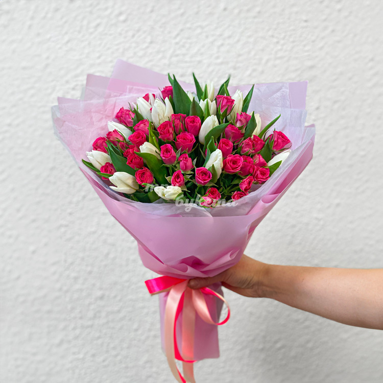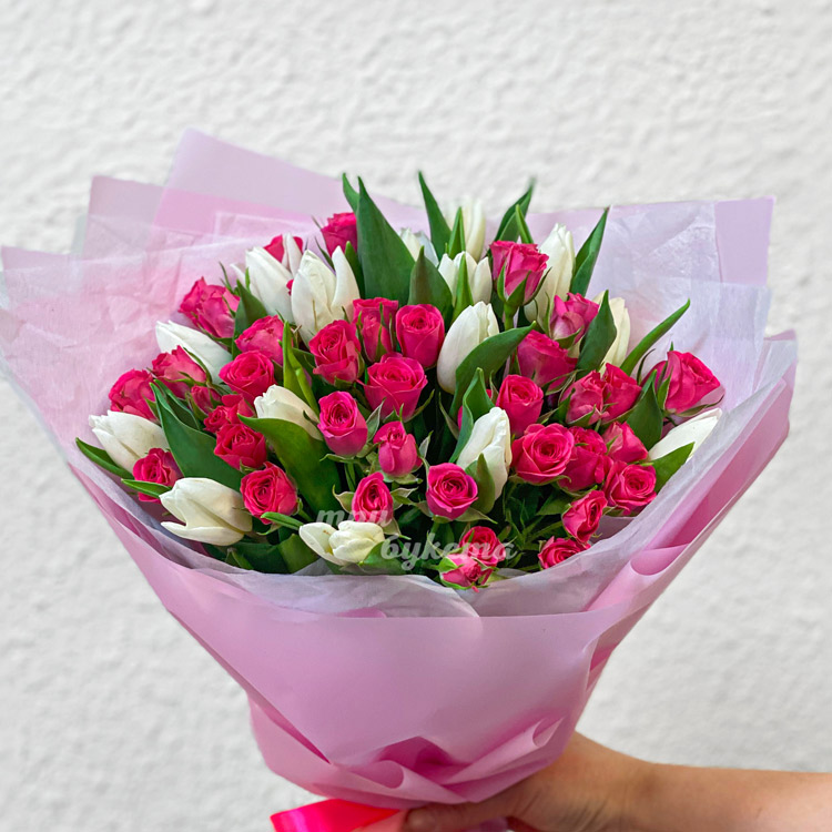 Букет розовых куст. роз и белых тюльпанов