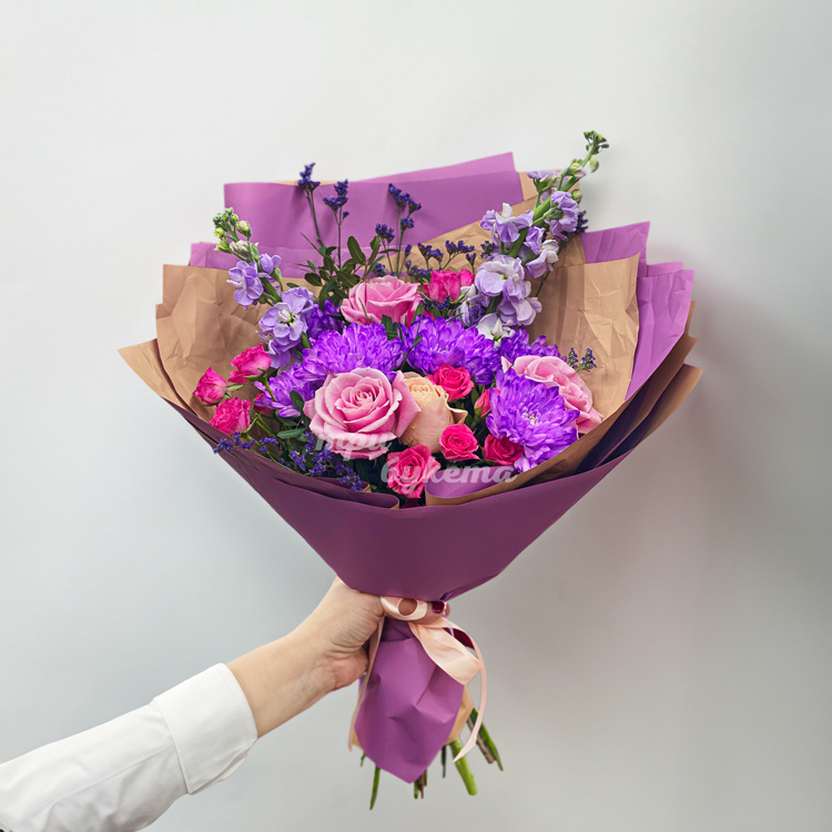 Букет розовых роз и сиреневых хризантем