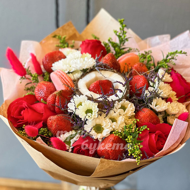 Букет с макарунами и клубникой
