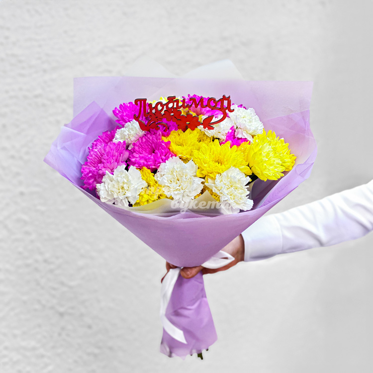 Букет ярких хризантем с белыми гвоздиками