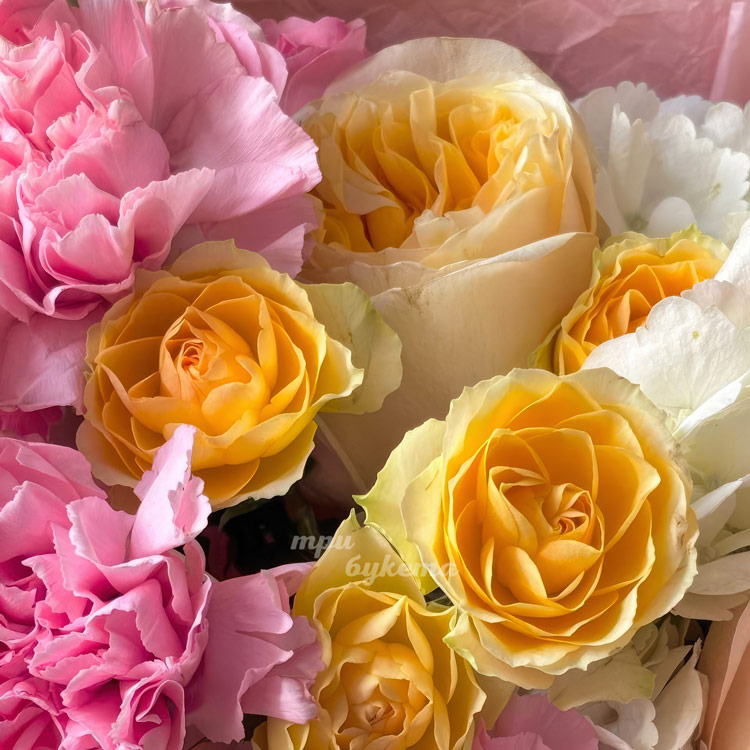 Букет ярких роз и диантусов с гортензией