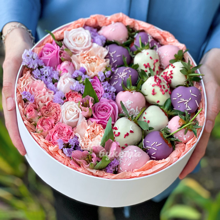 Комп. из цветов и 15 клубник в шоколаде
