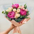 Композиция из роз, гвоздик и хлопка