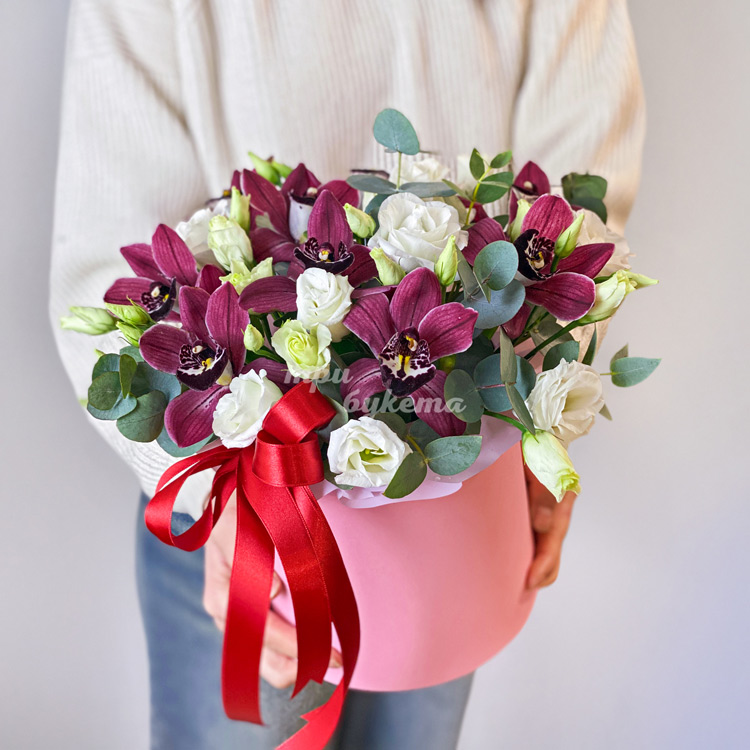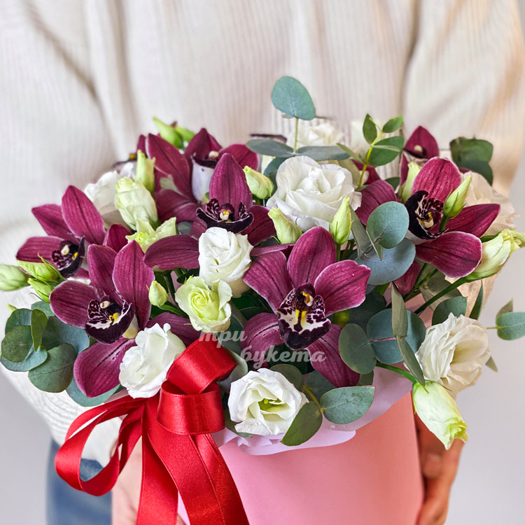 Коробка бордовых орхидей и белых эустом