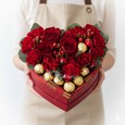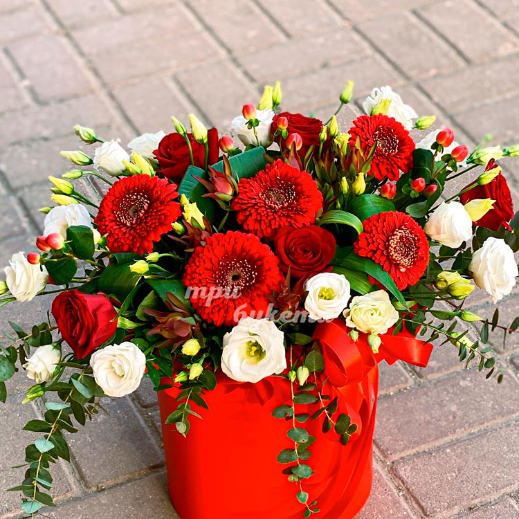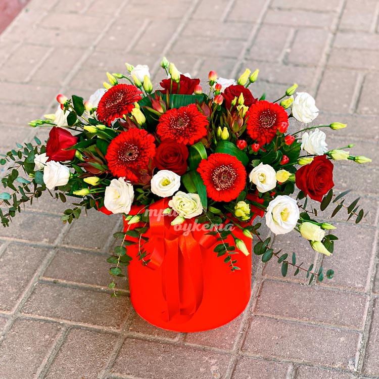 Коробка красных гербер и белых эустом