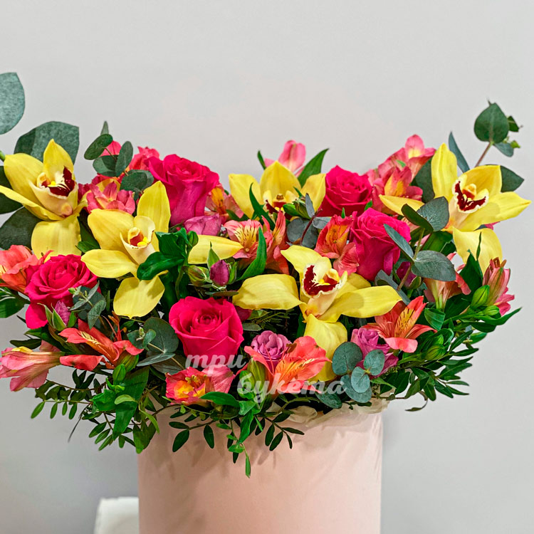Коробка желтых орхидей и розовых роз