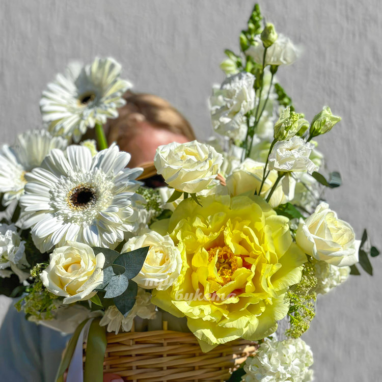 Корзина белых гербер с желтым пионом