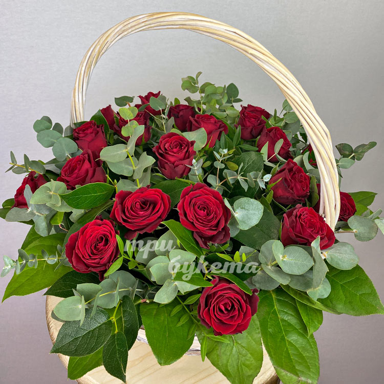 Корзина красных роз с эвкалиптом