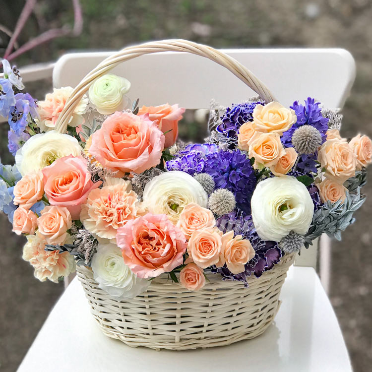 Корзина ранункулюсов, роз и гвоздик