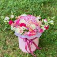 Корзина розовых роз и красных тюльпанов