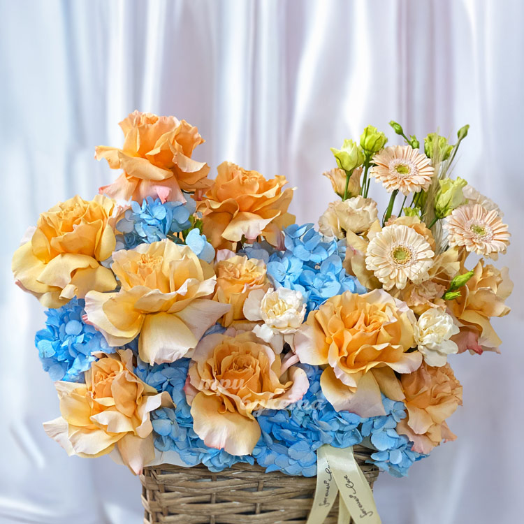 Персиковые розы с синими гортензиями в корзине