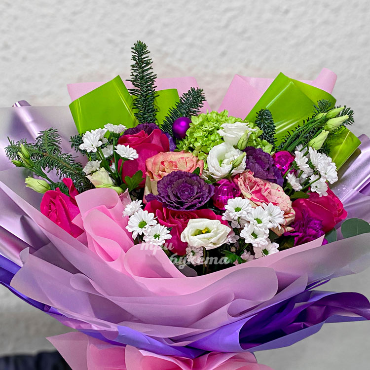 Пышный новогодний букет цветов и хвои