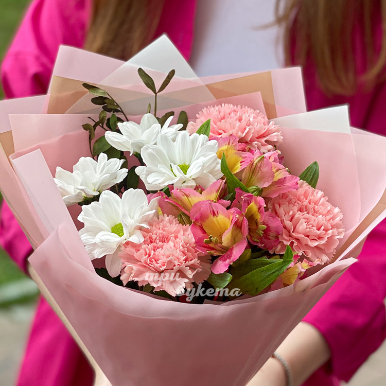 Розовый букет гвоздик и альстромерий