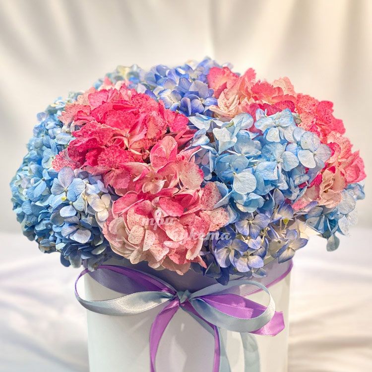 Шляпная коробка синих и розовых гортензий