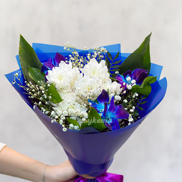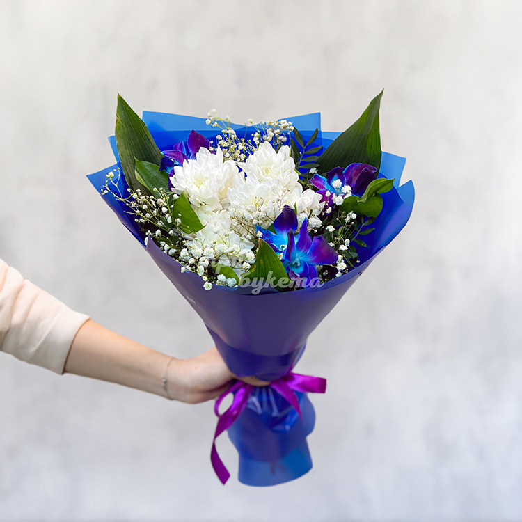 Синий букет хризантем, орхидей и гипсофилы